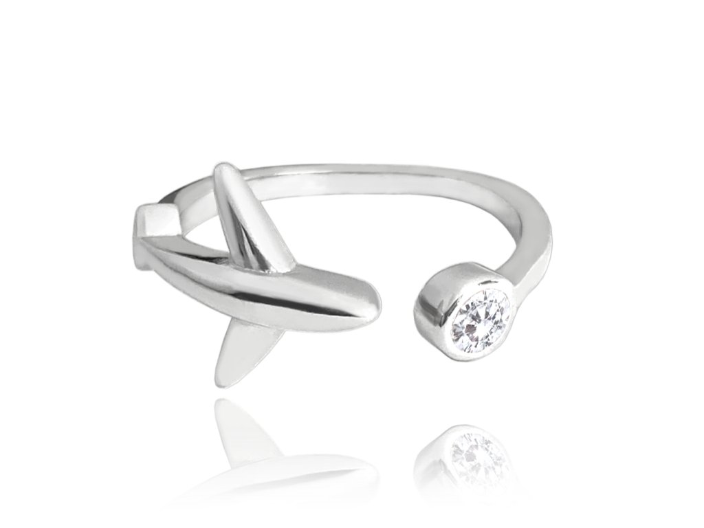 Cestovatelský stříbrný prsten LETADLO s bílým zirkonem