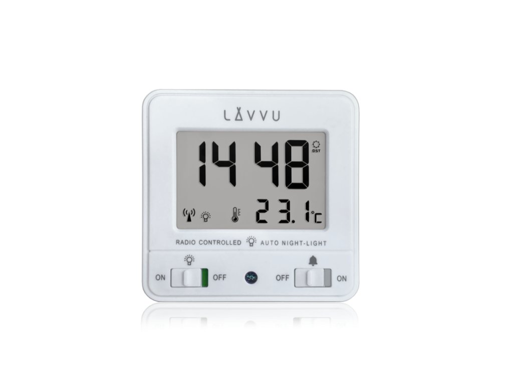 LAVVU Digitální budík řízený rádiovým signálem NORDLYS bílý se světelným senzorem