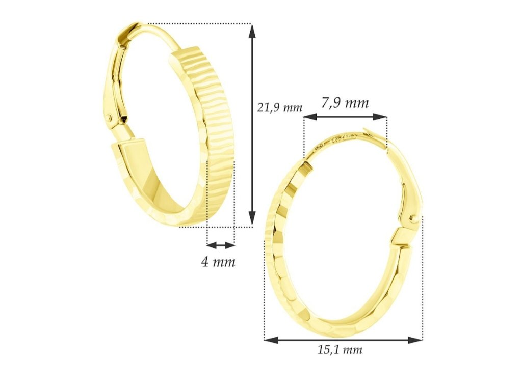 Rozměry: | Rozměry (cca): Výška 21,5 mm. Šířka 4 mm. Hloubka náušnice 15 mm. Hloubka zapínání 8 mm. |