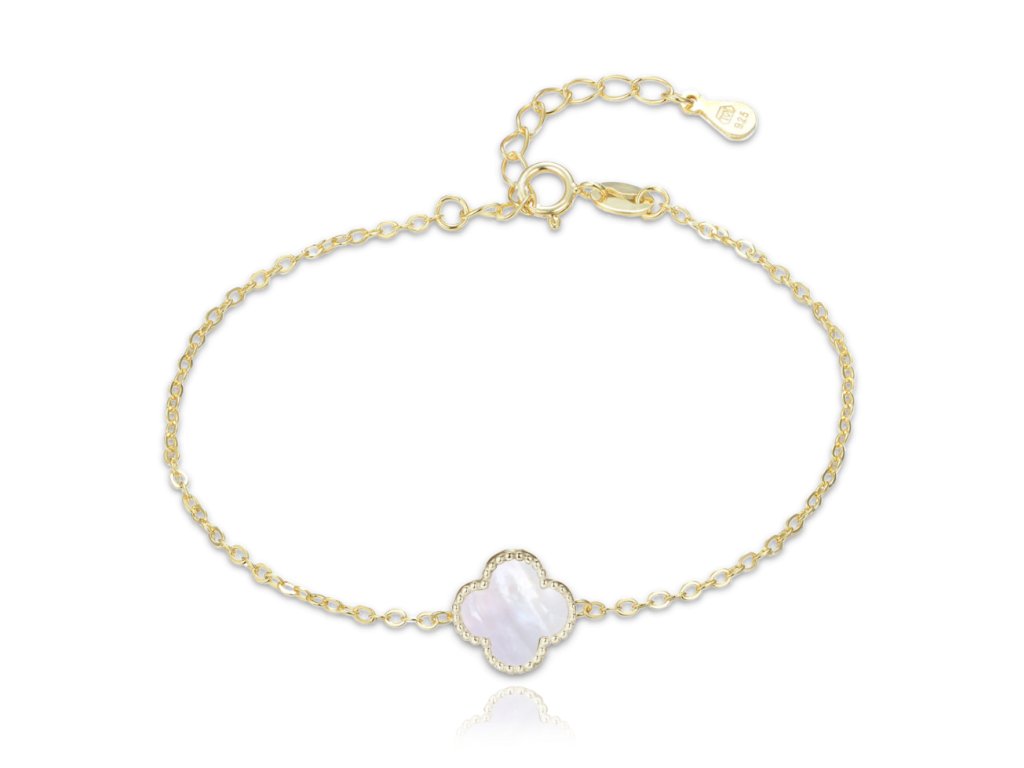 Pozlacený stříbrný náramek čtyřlístek s bílou perletí