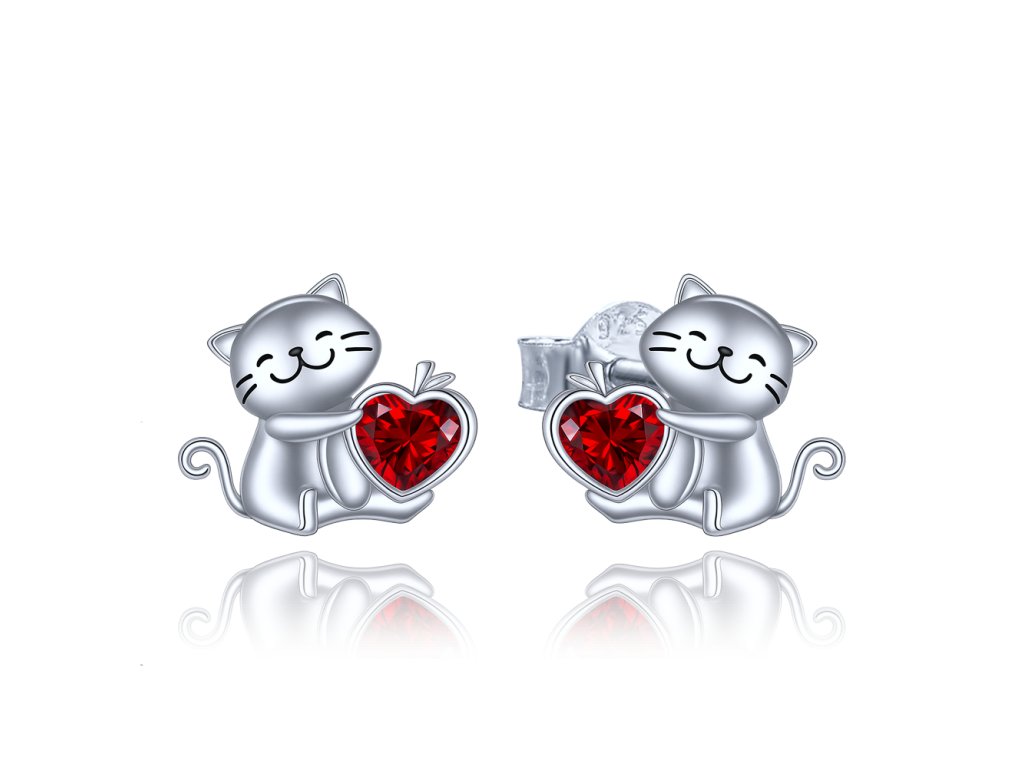 Stříbrné náušnice kočky se srdíčkem s červenými zirkony