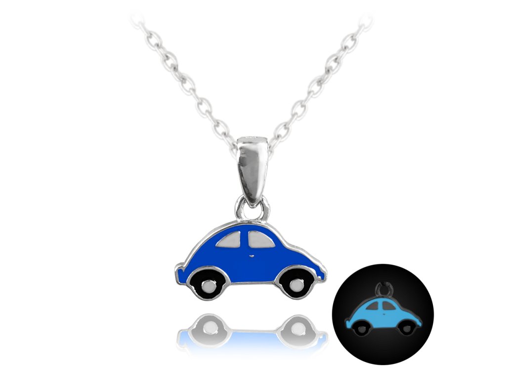 Svítící modrý dětský stříbrný náhrdelník AUTO