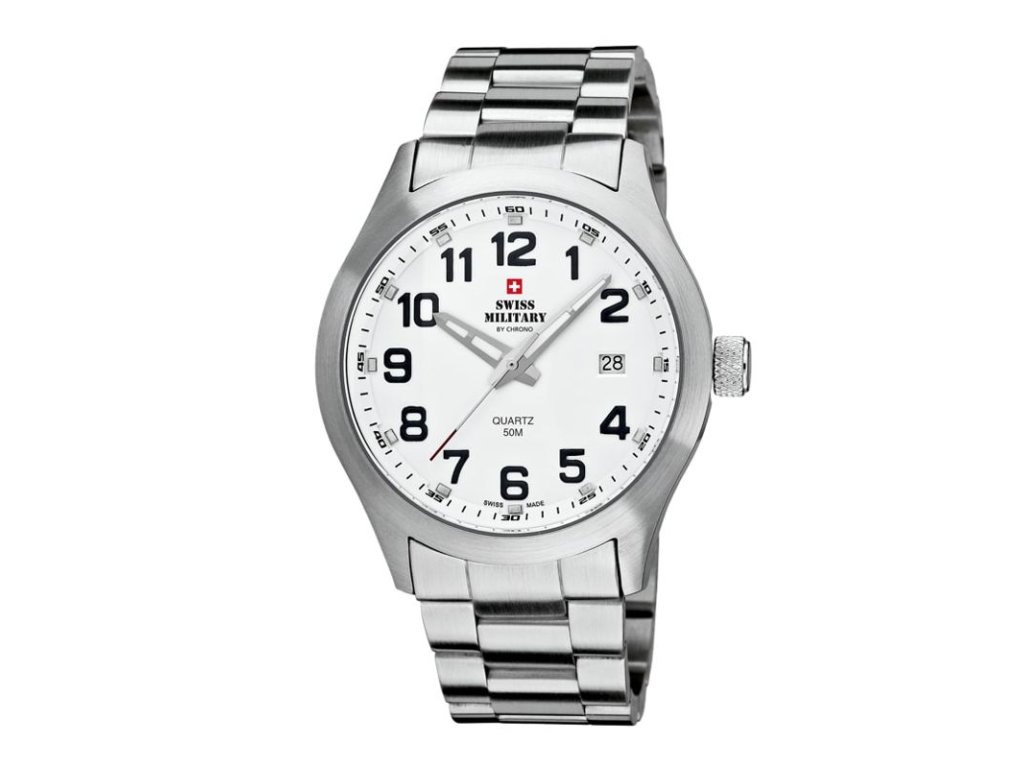 Pánské náramkové hodinky Napájení z baterie Průměr pouzdra 42,0 mm Pouzdro ve tvaru kruhu Ocelové pouzdro Stříbrná barva pouzdra Ocelový tah Stříbrná barva tahu Ručičkový ciferník Bílá barva ciferníku Ciferník s arabskými čísly Materiál skla - minerální sklo Odolné proti vodě během sprchování a mytí Datum