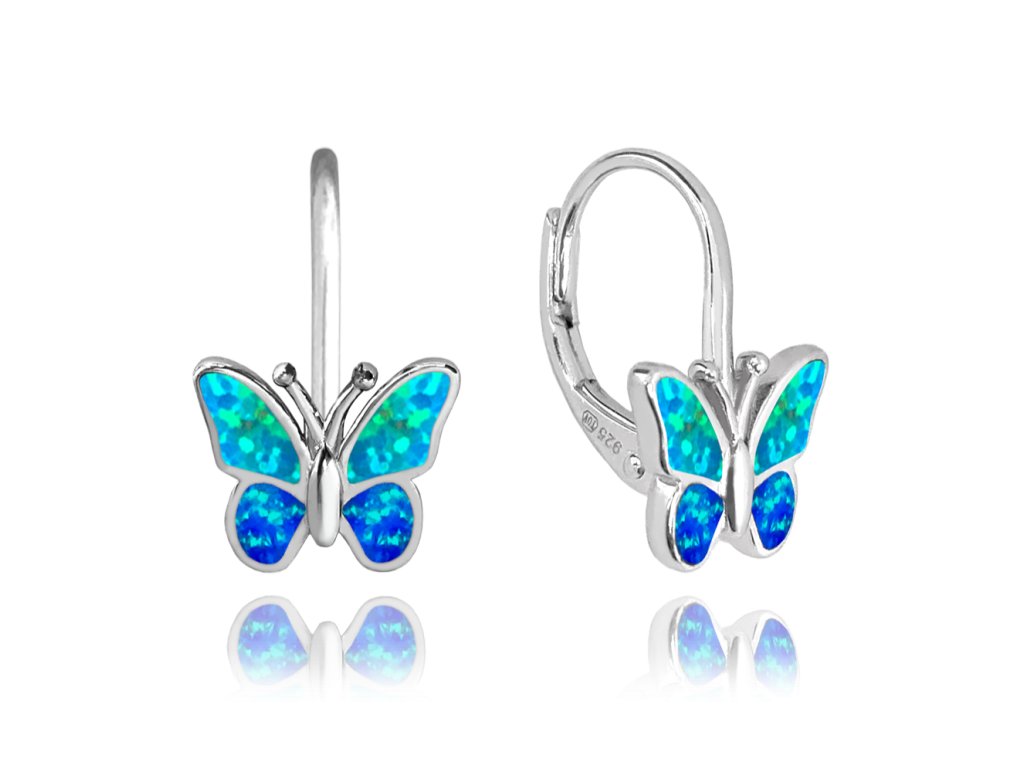 Třpytivé dětské stříbrné náušnice MOTÝLCI s modrým opálem