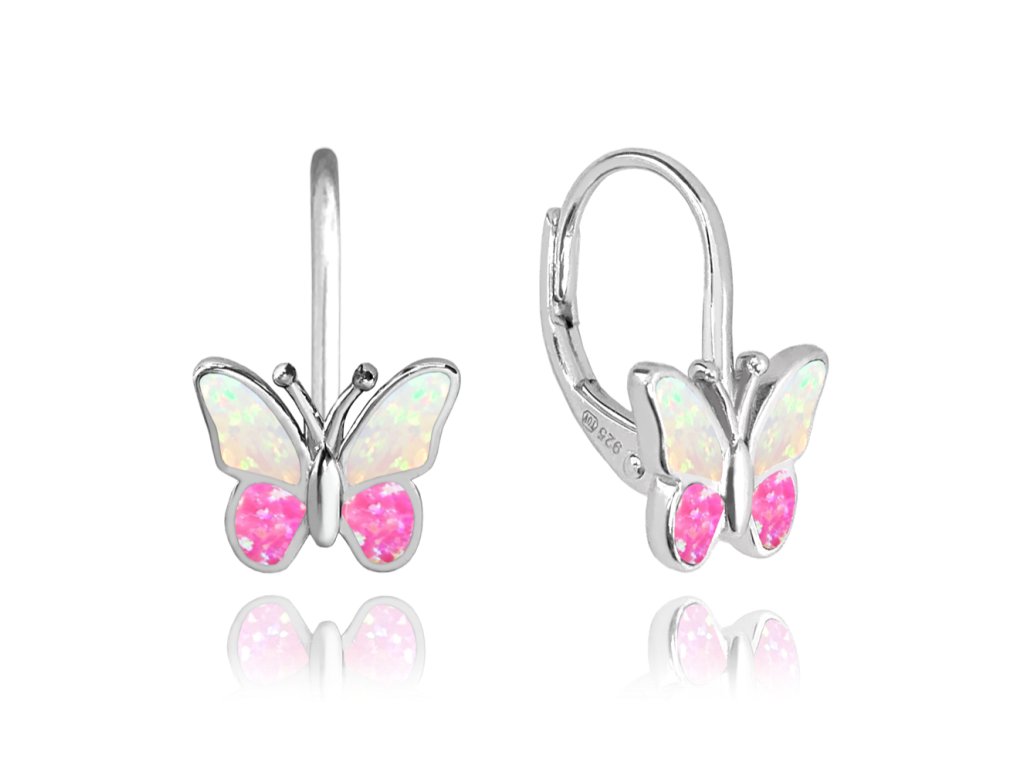Třpytivé dětské stříbrné náušnice MOTÝLCI s růžovým opálem